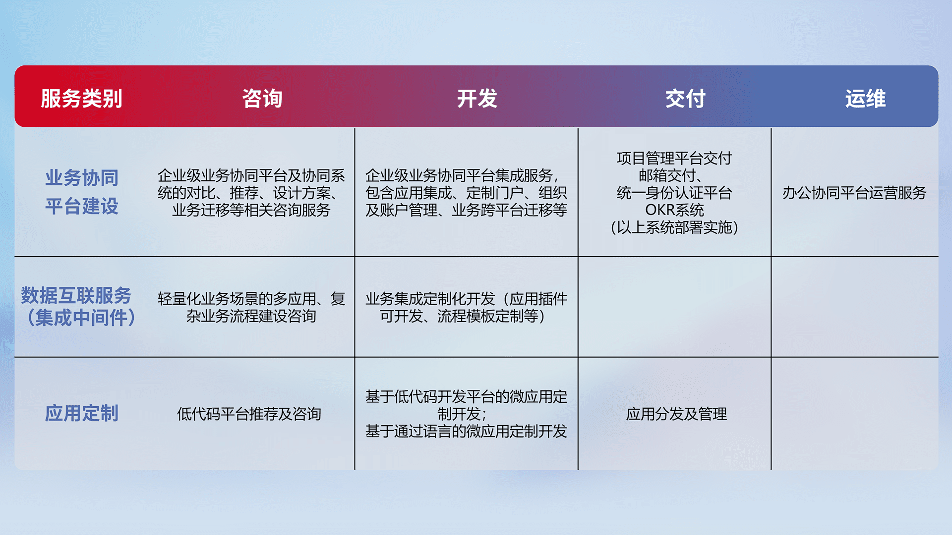 针对钉钉、、企微、、IDaas等平台级产品提供产品的规划、、、、方案、、、、交付、、、、定制化开发等服务,,,,实现如统一协同办公、、智能客户服务、、、、混合会议管理、、、、智能数据查询、、、等业务场景,,实现数字化转型。。。